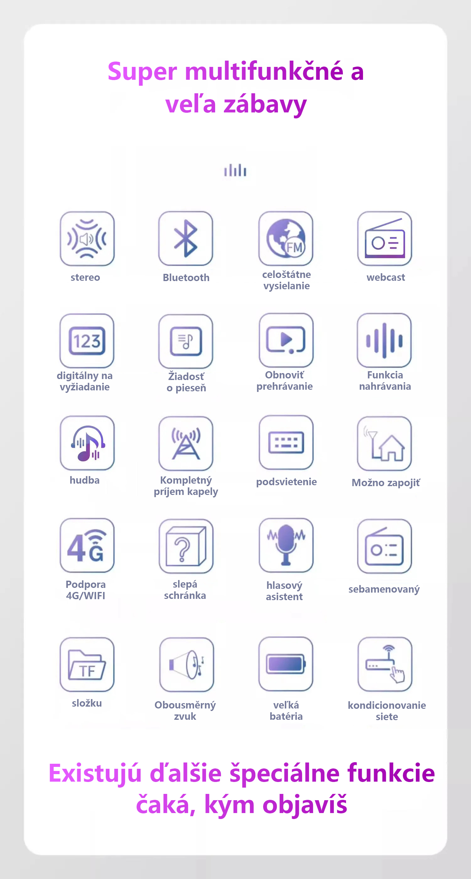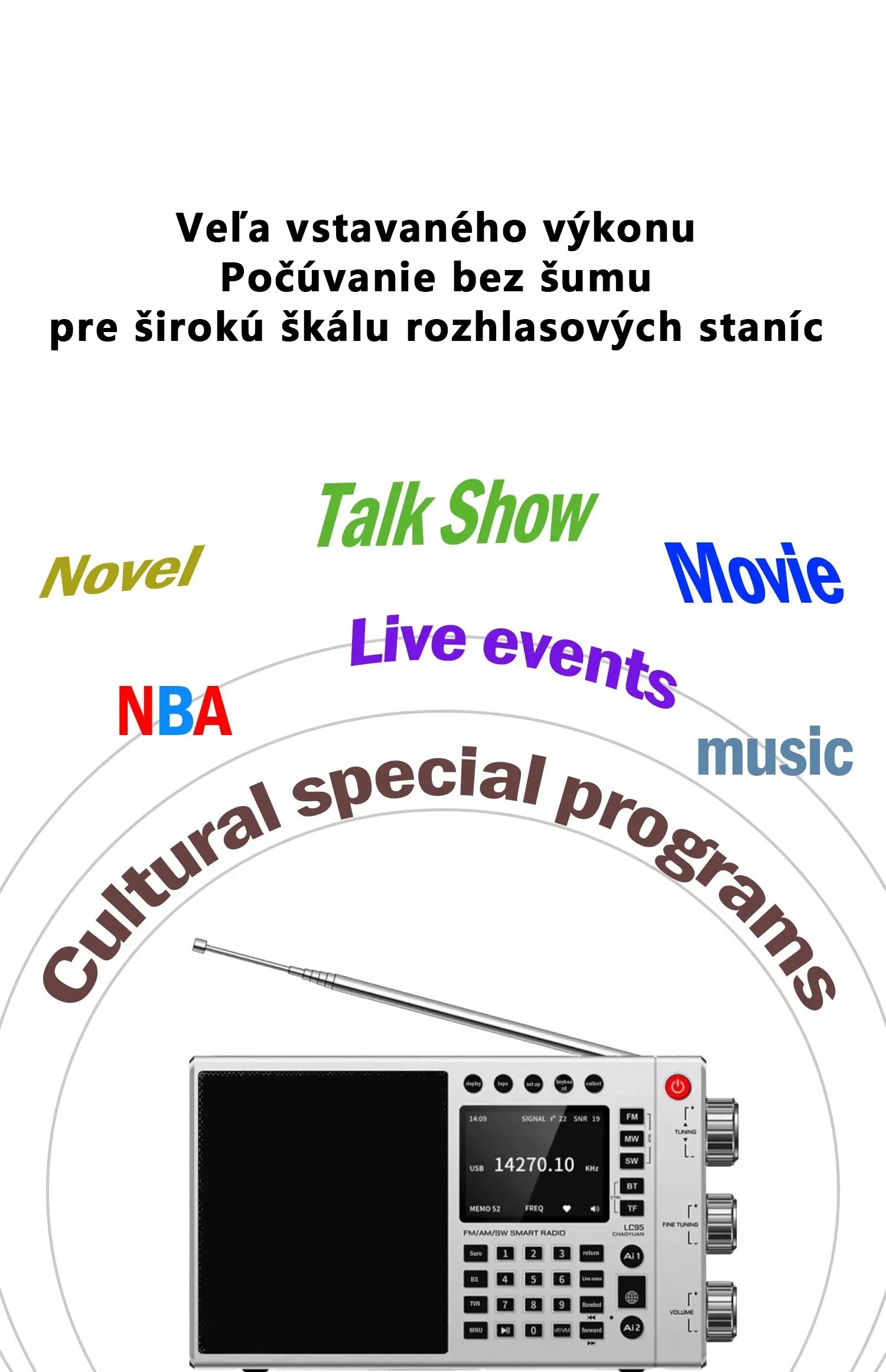 Toto rádio dokáže nielen sledovať mnoho online filmov, ale podporuje aj rozlíšenie 4K, čím prináša čistý a jemný obraz. Je kompatibilný s 5G a Wi-Fi pripojením, čo zaisťuje rýchle a plynulé prehrávanie. Zároveň je vybavený technológiou ultrazvukovej kvality, ktorá vám umožní vychutnať si pohlcujúcejší audio-vizuálny zážitok, ktorý sa dokonale hodí pre rôzne zábavné potreby.