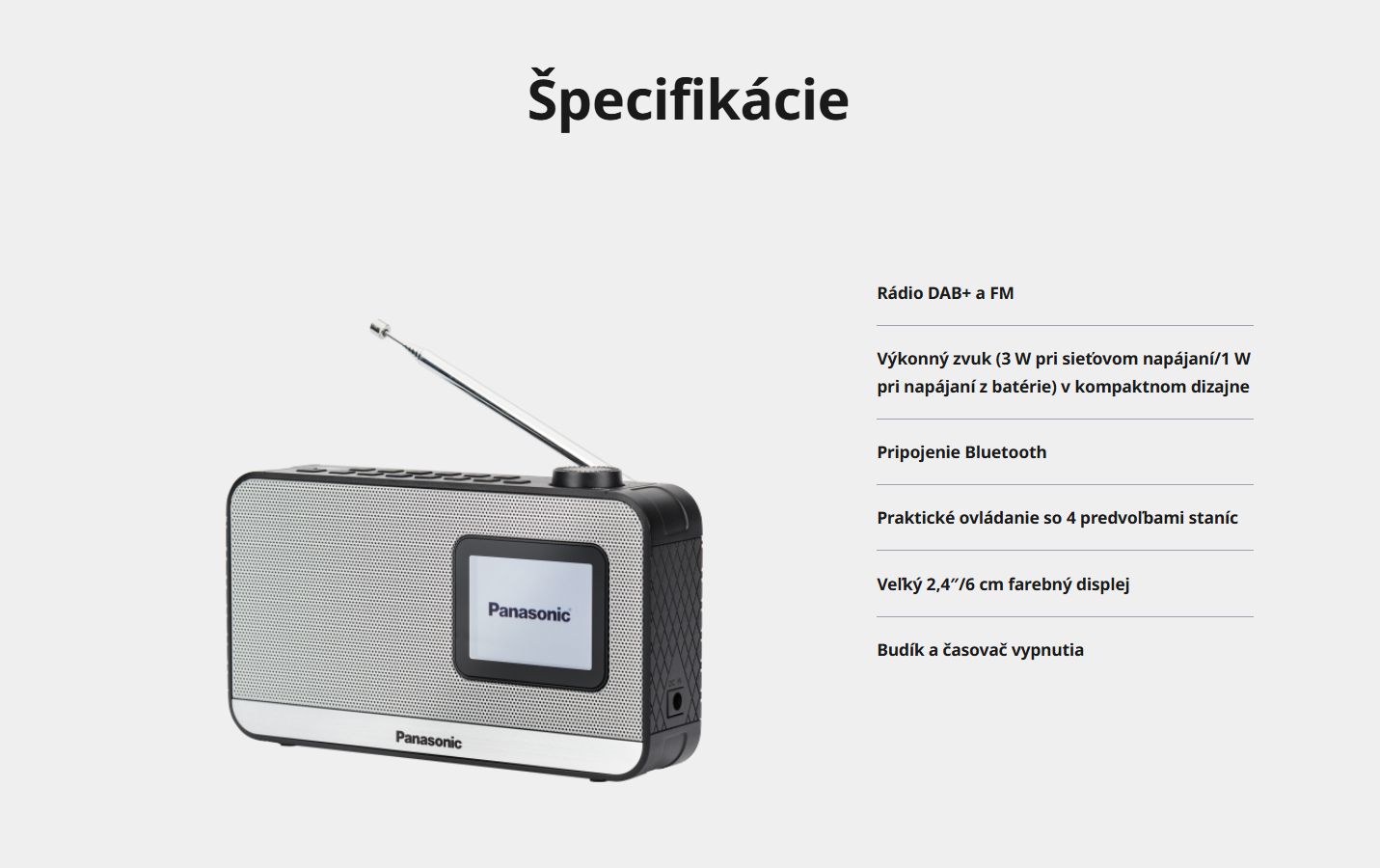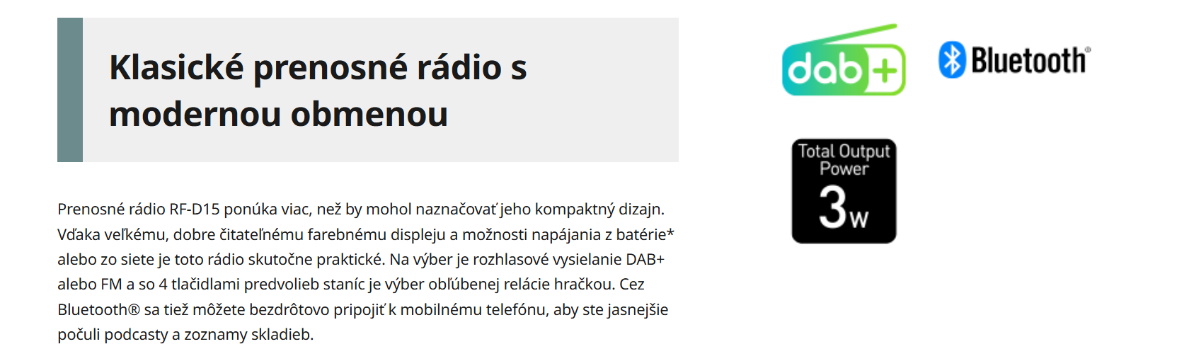 Toto kompaktné prenosné rádio má 5 cm reproduktor, ktorý po zapojení do siete poskytuje výkon 3 W. Vďaka tomu dokonale spĺňa požiadavky na praktickú prenosnosť a zvukový výkon.